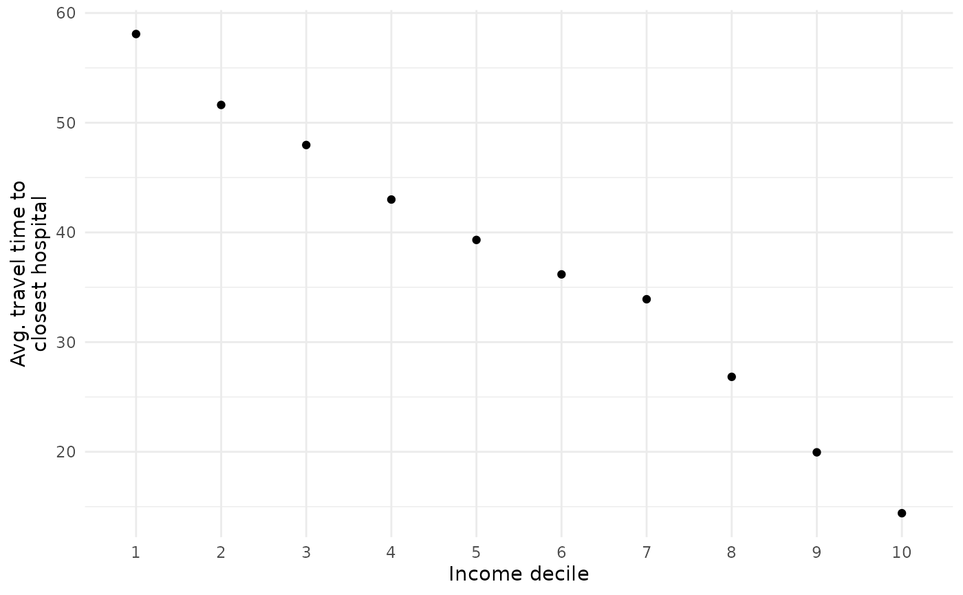 labs(x='Income decile', y='Avg. travel time to\nclosest hospital') +