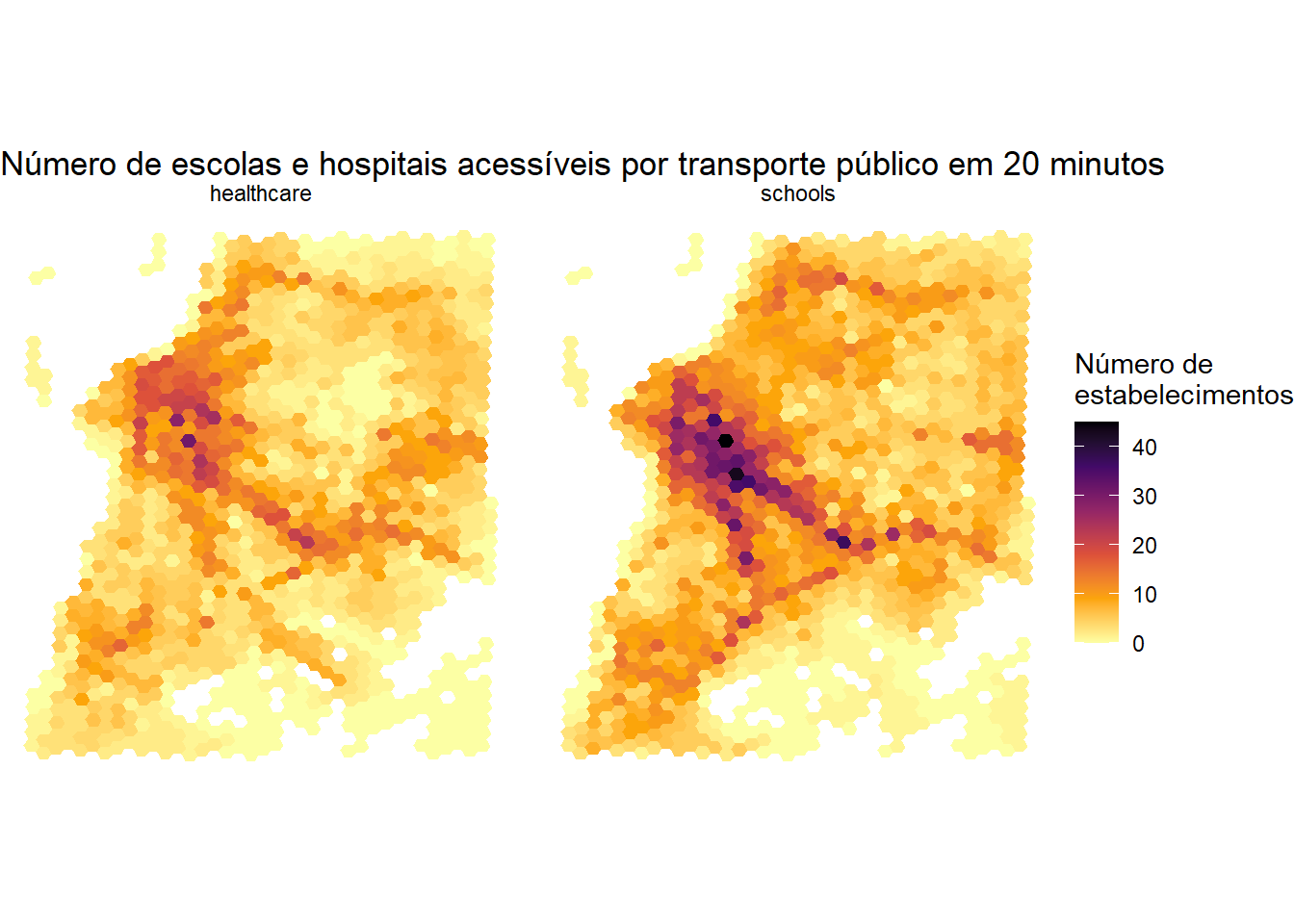 labs(title = 'Número de escolas e hospitais acessíveis por transporte público em 20 minutos',