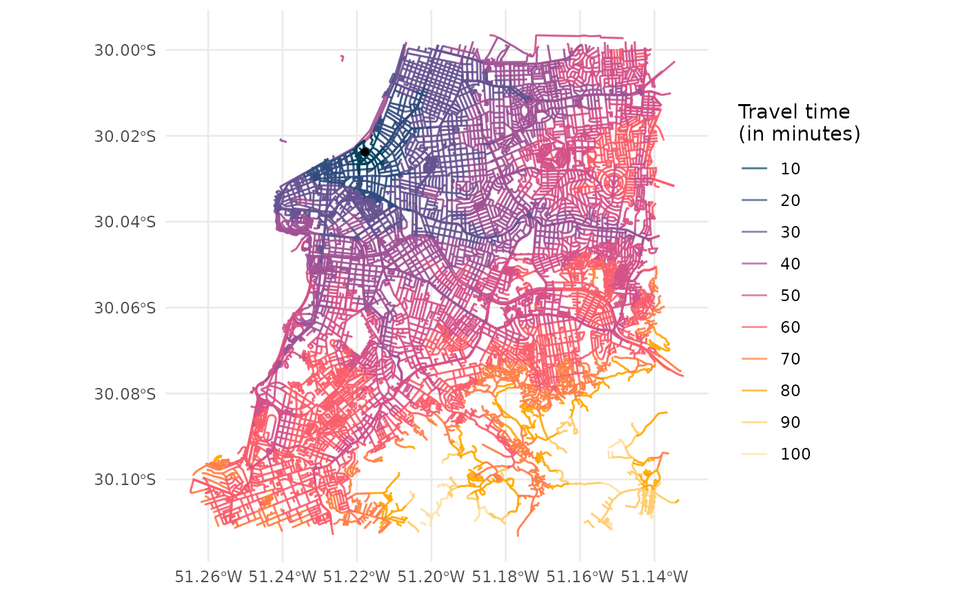 #> 6 LINESTRING (-51.19686 -30.0...Now it becomes super simple to visualize our isochrones on a map: